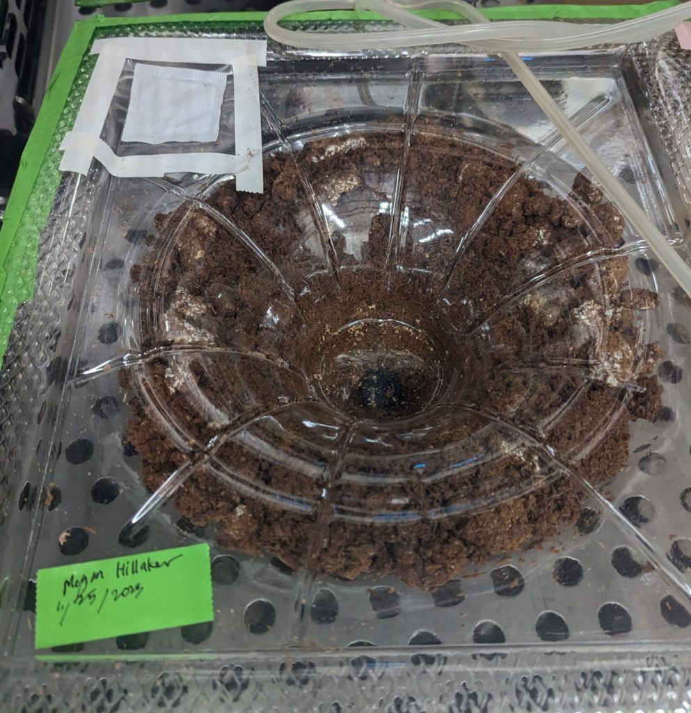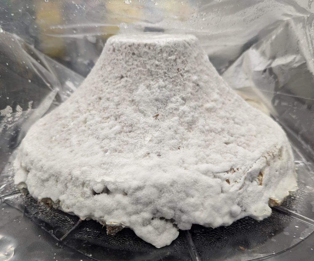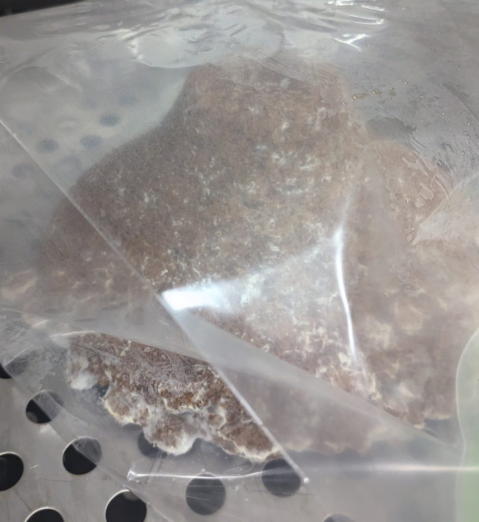 I set out on this project with the intent to create a hanging bell-like sculpture. I began by sterilizing the oak substrate and inoculating it after a short delay with an additional flour slurry to jumpstart growth. After a few days in the incubator, I packed my mold with the inoculated substrate, adding an extra grate for additional oxygen, and returned it to the incubator for a week. The Mycelium grew very well with no contamination, but was not strong enough to demold, and where it was pressed to the plastic, little of the white coating appeared. I then removed the mold on one half of my object, and returned to the bag and incubator. After four more days of growth, the substrate was well-connected, and the coating was fairly dense. Due to time constraints, I decided to demold at this time, but given the opportunity, I would have left the mycelium to grow for a bit more time. After demolding, I placed the object in the incubator at 60 degrees Celsius for five hours and left overnight at 42 degrees Celsius. The next day I heated the mycelium at 60 degrees for another few hours, after which it was dry enough to remove. To complete my piece, I made an oil-based paint out of mussel shell pigment and linseed oil. (Water-based paints will not work on mycelium as it is hydrophobic.)