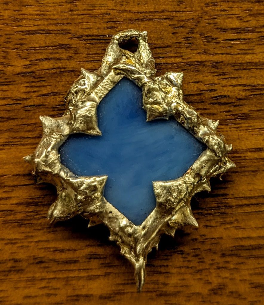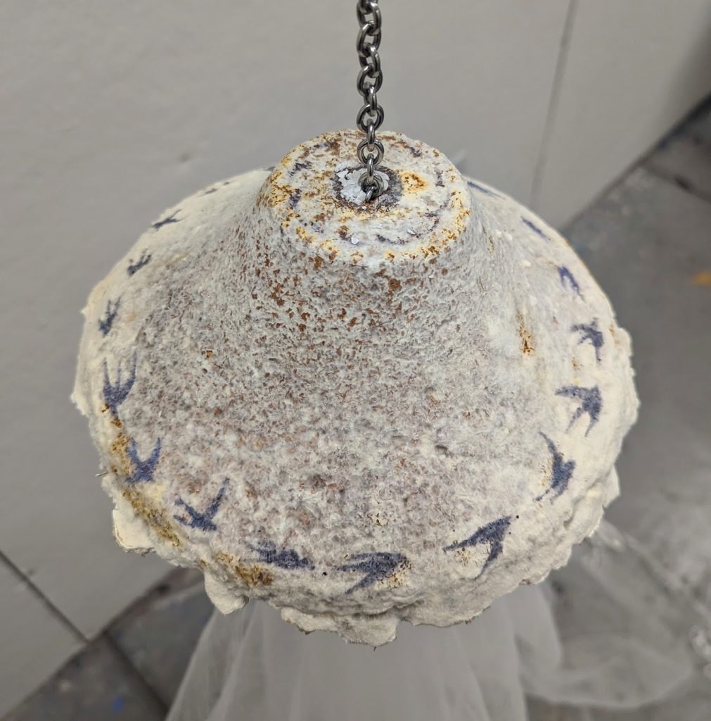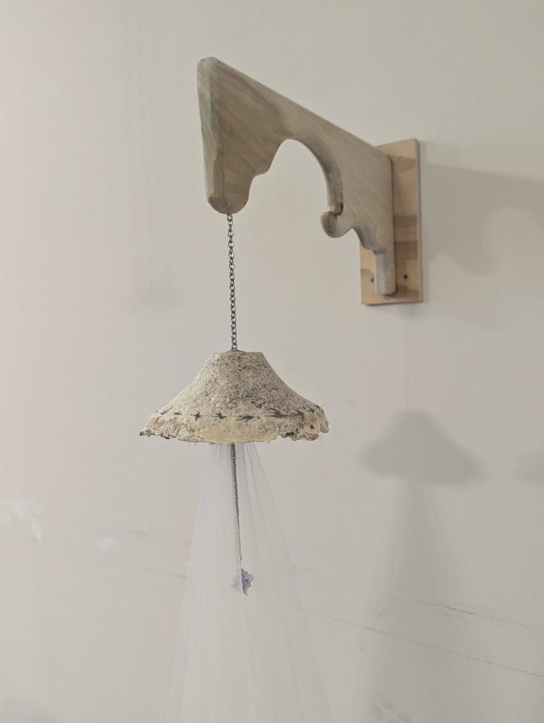 This is a sculpture made from reishi mycelium, soldered reclaimed glass, bridal veil, mussel shell pigment, and wood. The item I used to create the initial mold was my father’s trombone bell. I have been thinking a lot about themes of loss and growth, particularly how we record time and attempt to hold onto the past. I think the mycelium is an excellent metaphor for the idea of growing into our grief and holding pieces of our past together with our future. I was also considering the bell as a symbol for welcoming in the new and leaving parts of the old behind.