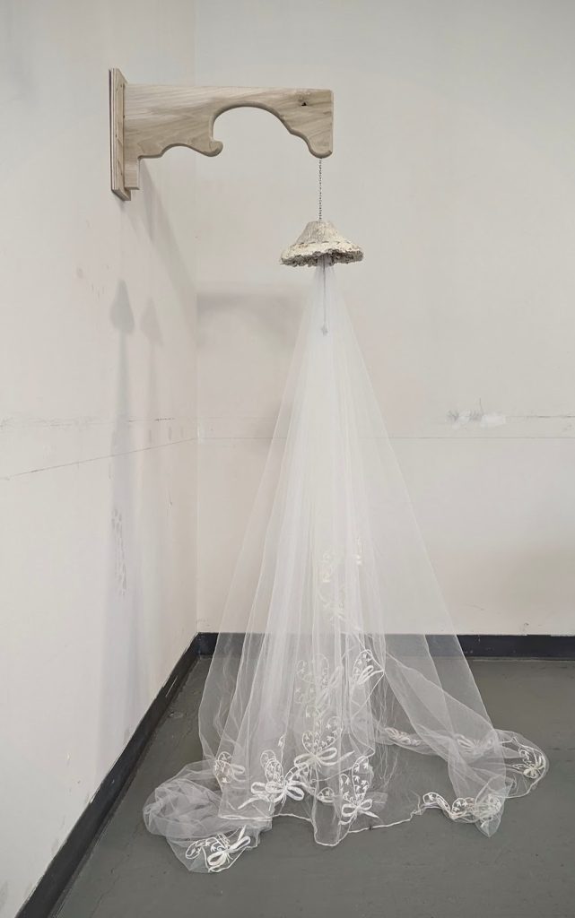 Reishi mycelium, soldered reclaimed glass, bridal veil, mussel shell pigment, wood.