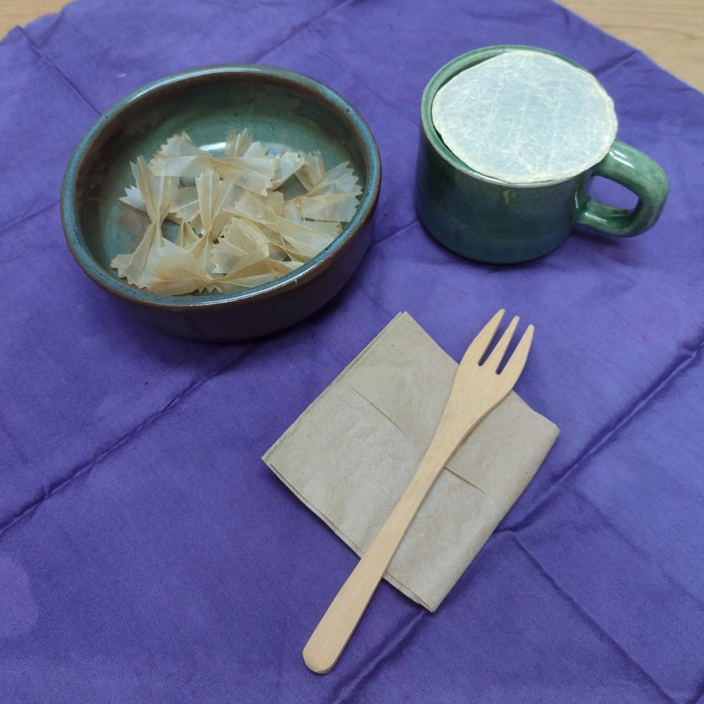 The pellicle dried pretty quickly, faster than I expected, and I had intended on using clips or clothespins of some kind to hold the pasta folds together as it dried, but by the time I went to pick it up from the lab it was already all the way dry. I pivoted to sewing, and each pasta was cut, gently folded, held in place with one tiny stitch in similar-colored thread right in the middle, and then decorated with the little zigzag edge. I would’ve used pinking shears if I had them but I did not so I used regular scissors and patience. They’re really cute and smell a little like feet/cheese/stinky as many pellicles do.
