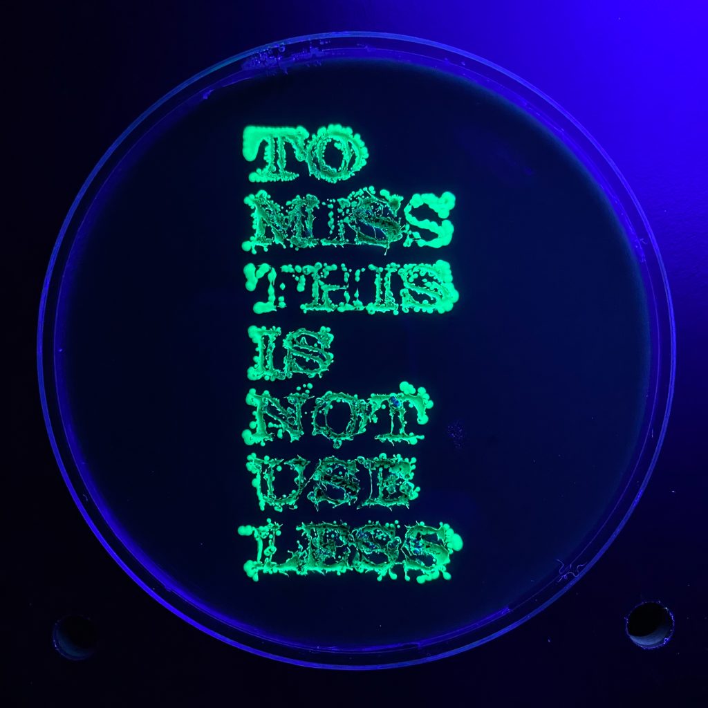 I wanted to take a timelapse of the genetically modified e. coli growing the phrase “to miss this is not use less,” originally planning to bioprint the fluorescent amajlime e.coli onto an antibiotic charcoal agar plate and film its growth. After a practice run with the bioprinter where the toothpick tip ended up dragging in & cutting into the agar, we spent ~3-4 hours adjusting the plane and running the bioprinter repeatedly to get a good print onto the uneven surface of the agar plate. However, the timelapse of that plate failed, due to having left the plate too open/introduced to airflow in an attempt to reduce condensation that would obstruct the filming – the agar completely dried up & nothing grew… (file is too big to upload onto site 🙁 )