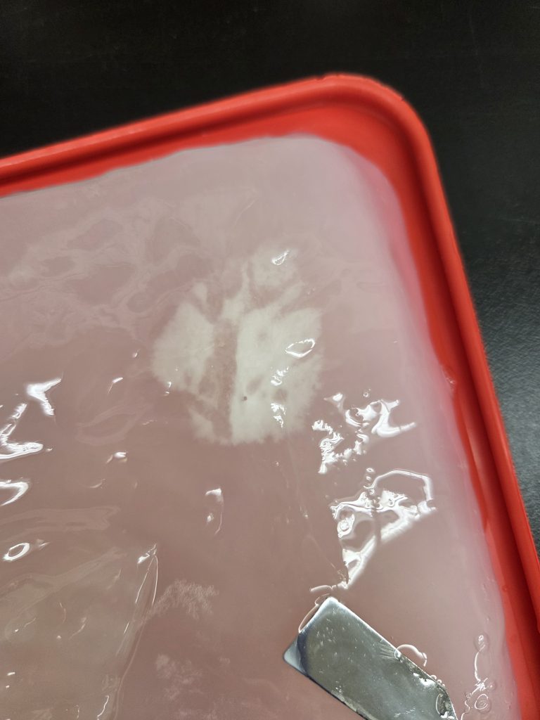 The process followed the laboratory protocol. I chose to use the medium-sized container. After 4 weeks, the pellicle had grown to 1 inch, but it had already begun to separate in half. It was not contaminated. During washing, the pellicle separated completely, creating two uneven pellicles with a lot of texture. I decided to use the 2% glycerol solution treatment and air drying due to the elastic and translucent qualities it provides. Since the sheets were very thin, weaving them was difficult, and I had to use glue to make the joins strong. Because there are two different pellicles, you can see the thinner one, the darker part of the fabric, and the thicker one, the lighter part of the fabric.