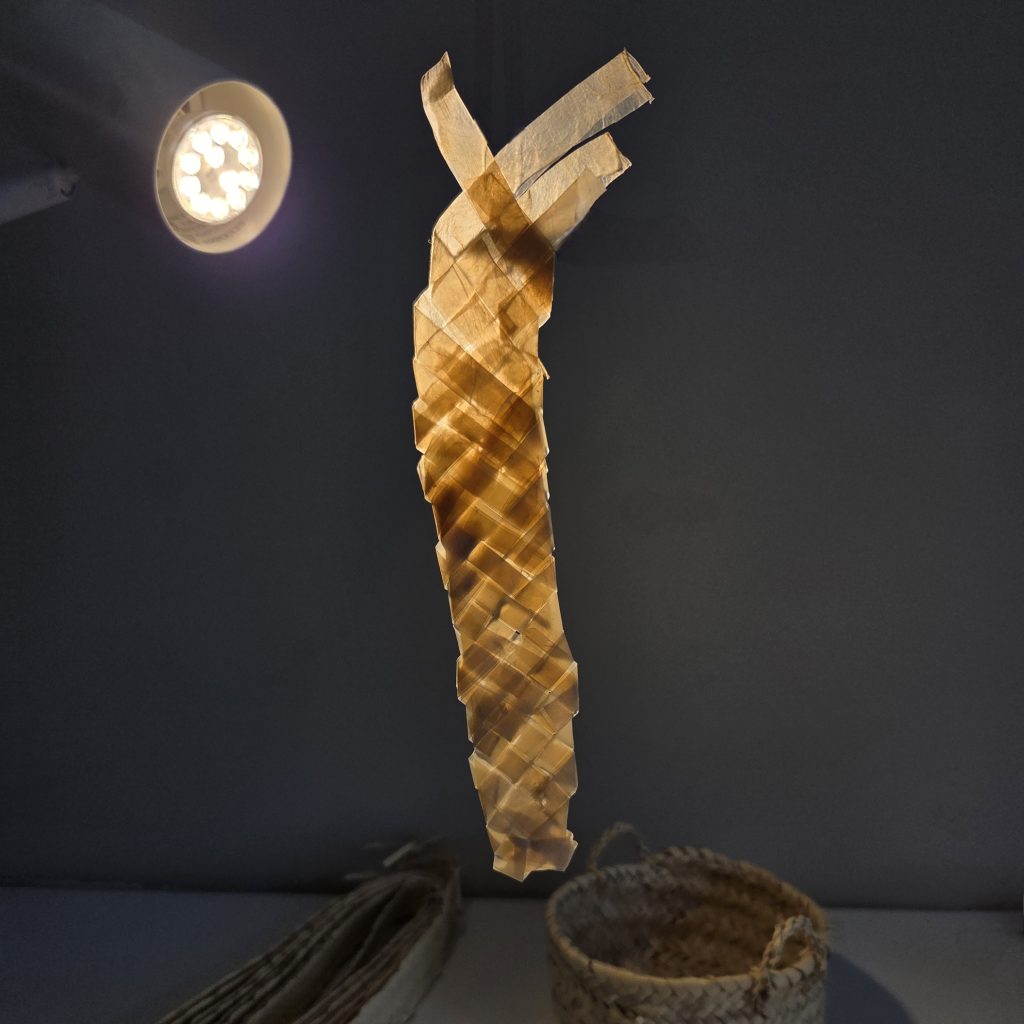 This project is an experiment to see if it’s possible to make llatra with bacterial cellulose. The conclusion is that the pellicle, before drying, needs to be about 1 inch thick to make weaving easier. My pellicle split into two very thin parts, which compromises the structure of the weaving. I was particularly interested in the translucency that the material has behind the light, and it created a beautiful pattern that I would like to experiment with in the future.