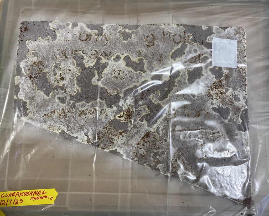 After ~1.5 weeks of growth in the plastic mold, we found that the mycelium had not really grown as much in the surfaces pressed up against the plastic mold, which were the “top” part of the piece with all the words – and thus carefully flipped the mycelium + wood substrate cast onto a plastic lid to expose it to more airflow/oxygen. The flipped over cast slab looked like it had lost almost all definition in the lettering, likely due to the relief of the letters not being deep enough to begin with. However, even just two more days of growth seemed to almost bring back some of the clarity of the words (although I had anticipating losing some legibility anyway) in places where the raised letters made contact with the plastic covering. Plus, the new growth of the mycelium presented a beautiful patterning across the surface of my slab.