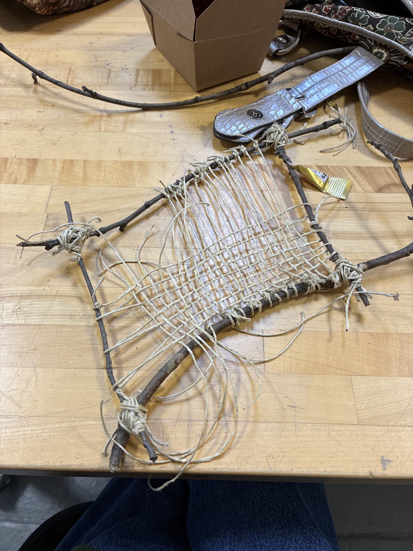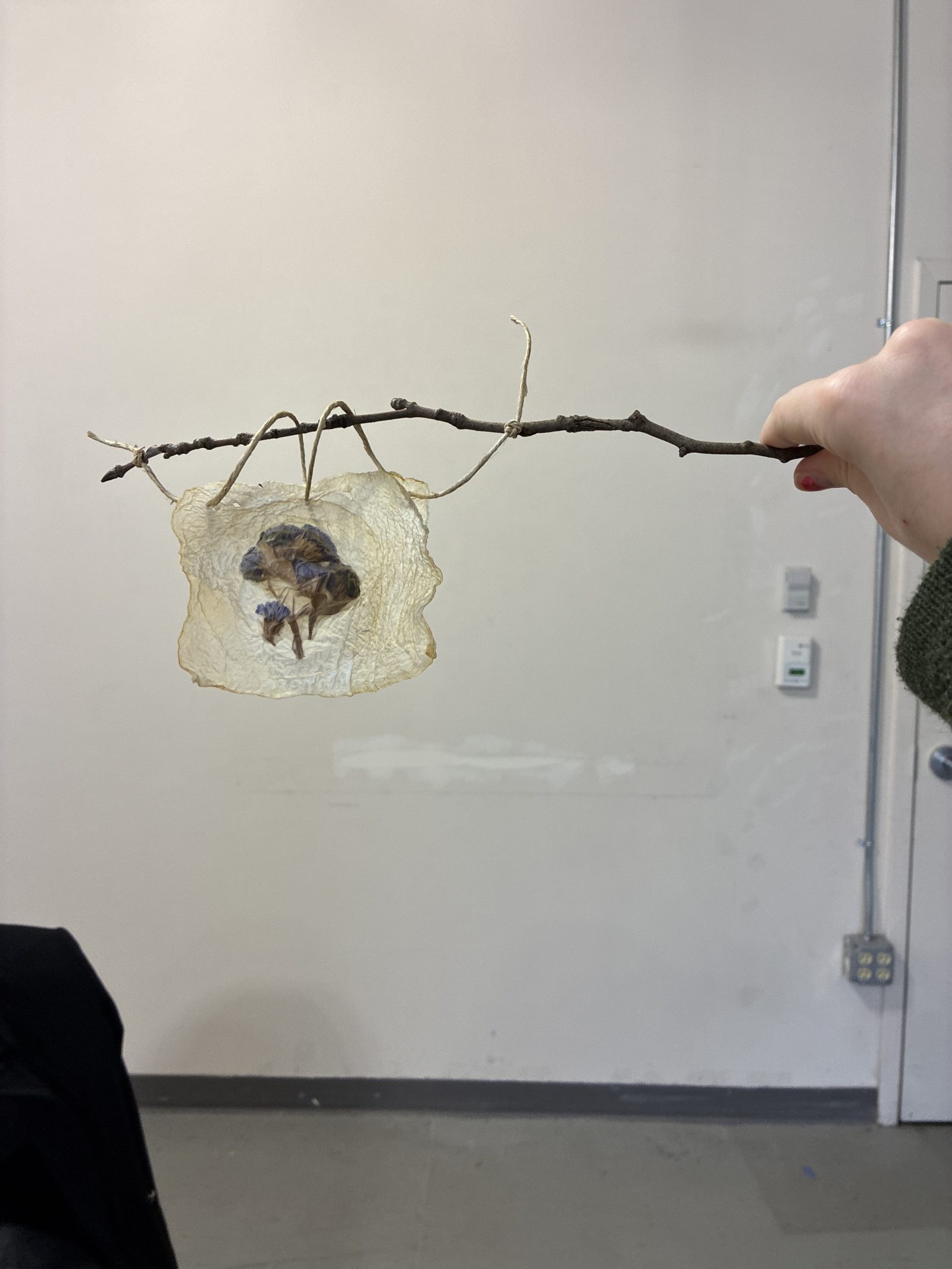 “FLAG 1”, structure made from sourced oak twigs and hemp cord with cellulose with a dried flower inclusion.