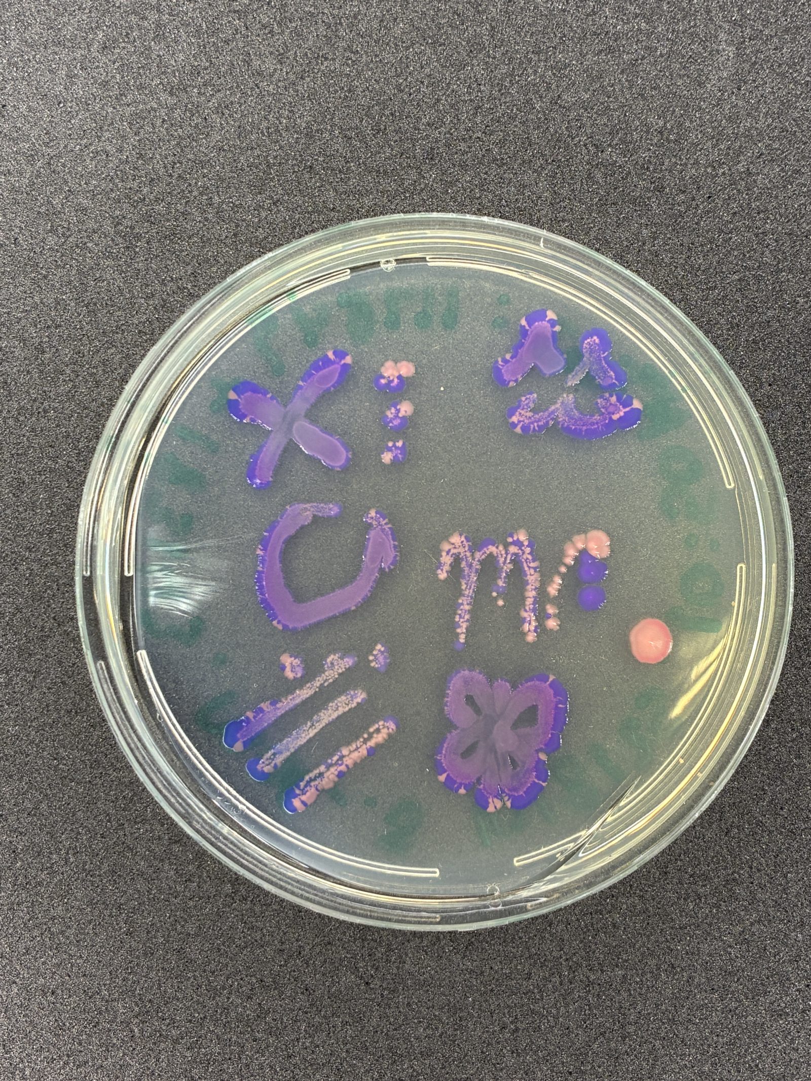 Stencils of Mallorcan embroidery by Antonia Barceló Oliver, LB agar plates, gloves, tape, genetic engineered E.Coli.
