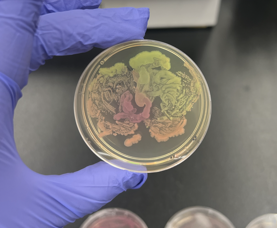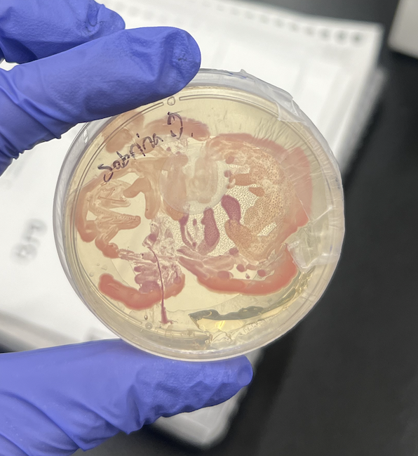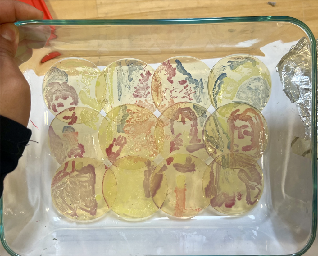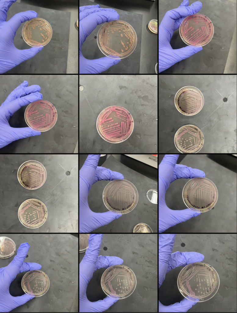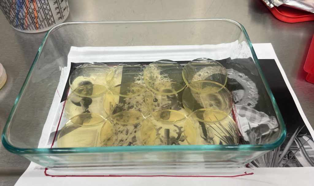 The most exciting thing to me during this first project in the lab was finding out that we had so many different shapes for all the plates to pour agar into. These “tiny, baby” ones were especially exciting to me and I knew immediately I wanted to use them despite not knowing what exactly I was doing with my project yet. Once I began pouring them and seeing all the plates lined up next to one another I liked the idea of having a layout similar where each individual plate can be sort of laid on top of one another in order to create one large canvas. When creating this larger canvas by plating the agar together to make one piece, it reminded me of a previous project I made by stitching small individual panels of cotton fabric to make a pillow which I cyanotyped family pictures onto. That piece, Mercado en Casa, was a nod to the fleeting of memories of my childhood and home as the pictures would fade away eventually over time. My bacterial cellulose project speaks to that, to the best of my ability I recreated one of these family pictures onto the poured agar. Using the genetically engineered bacteria we altered in the lab to draw the image, the image will only continue to grow over time, not fade. I can hold onto a distant memory a little bit longer.